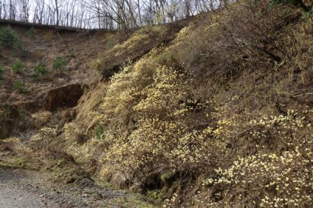 麓ではヒュウガミズキ、ダンコウバイをはじめ春の花は咲きだしていますが、標高が少し上がるとヒュウガミズキが少しとキブシ、マンサクなどが咲いている程度で、オオカメノキもまだウサギから変身(笑)していません。